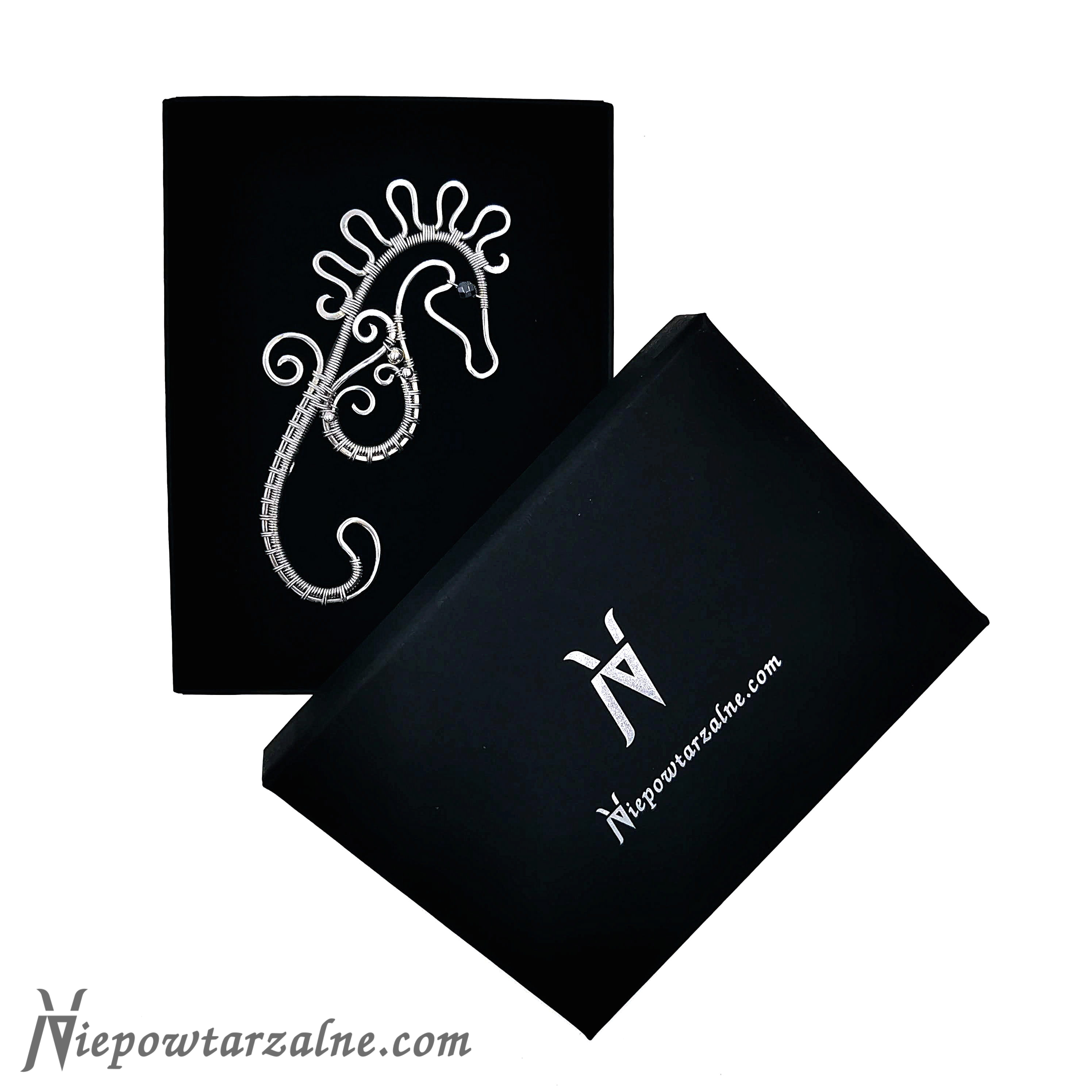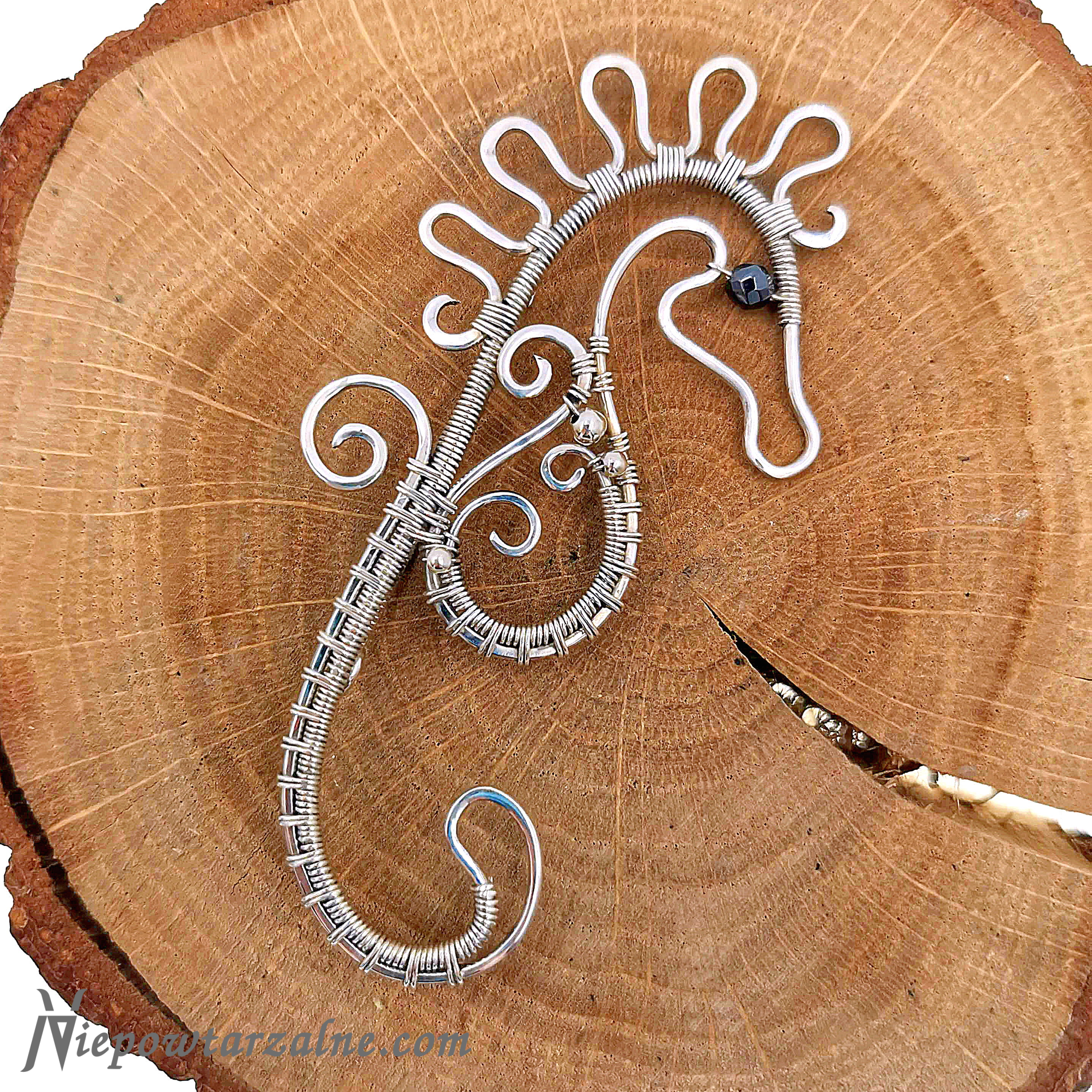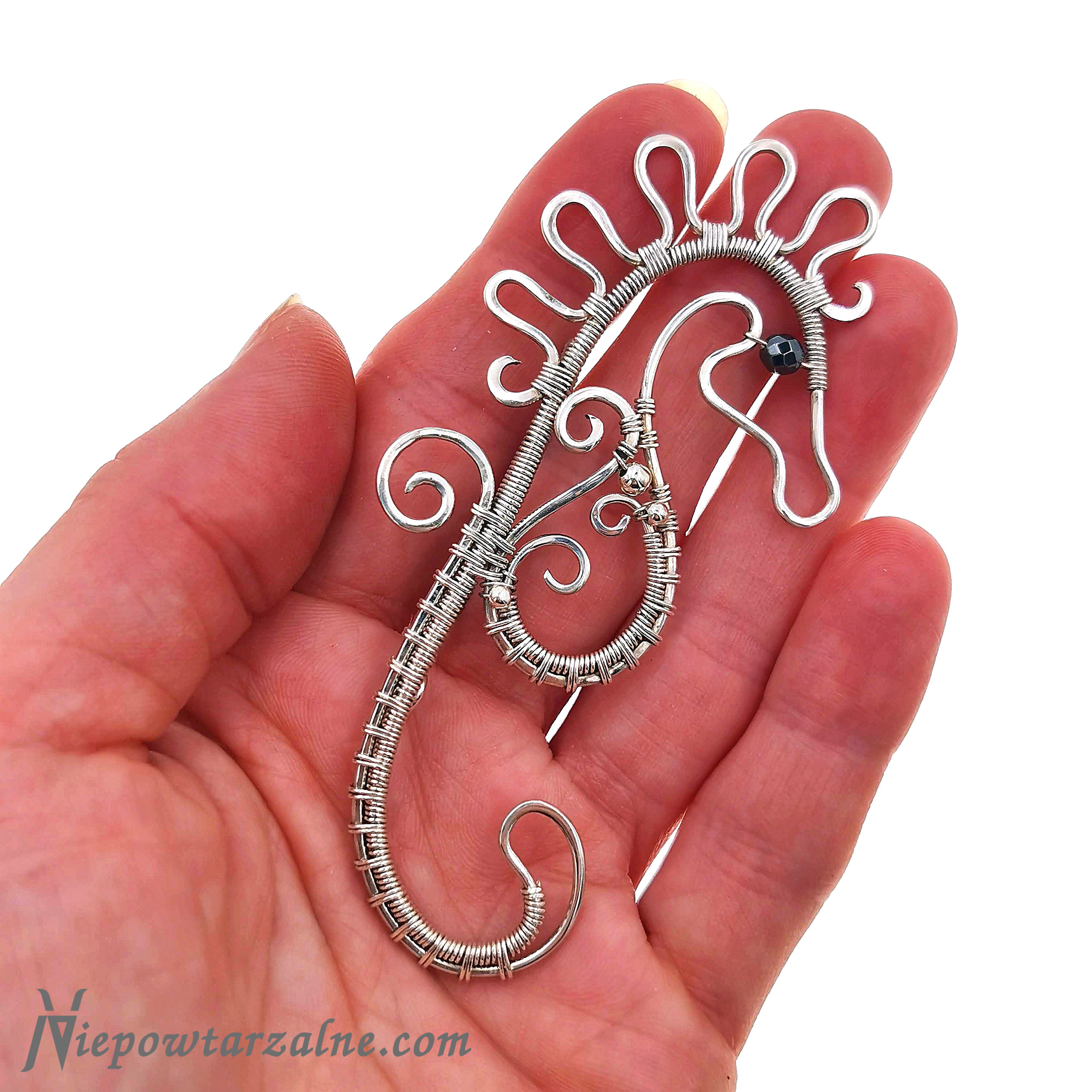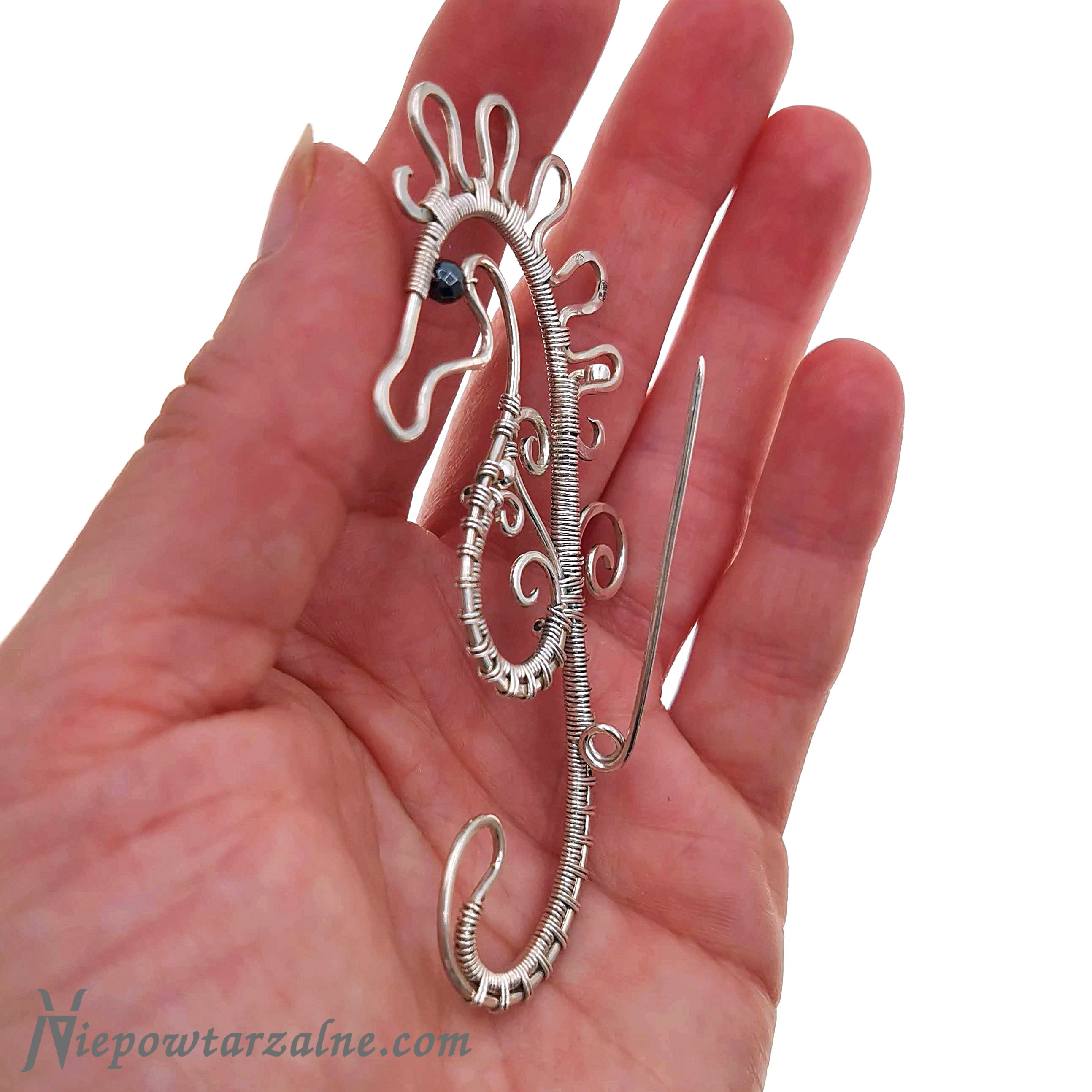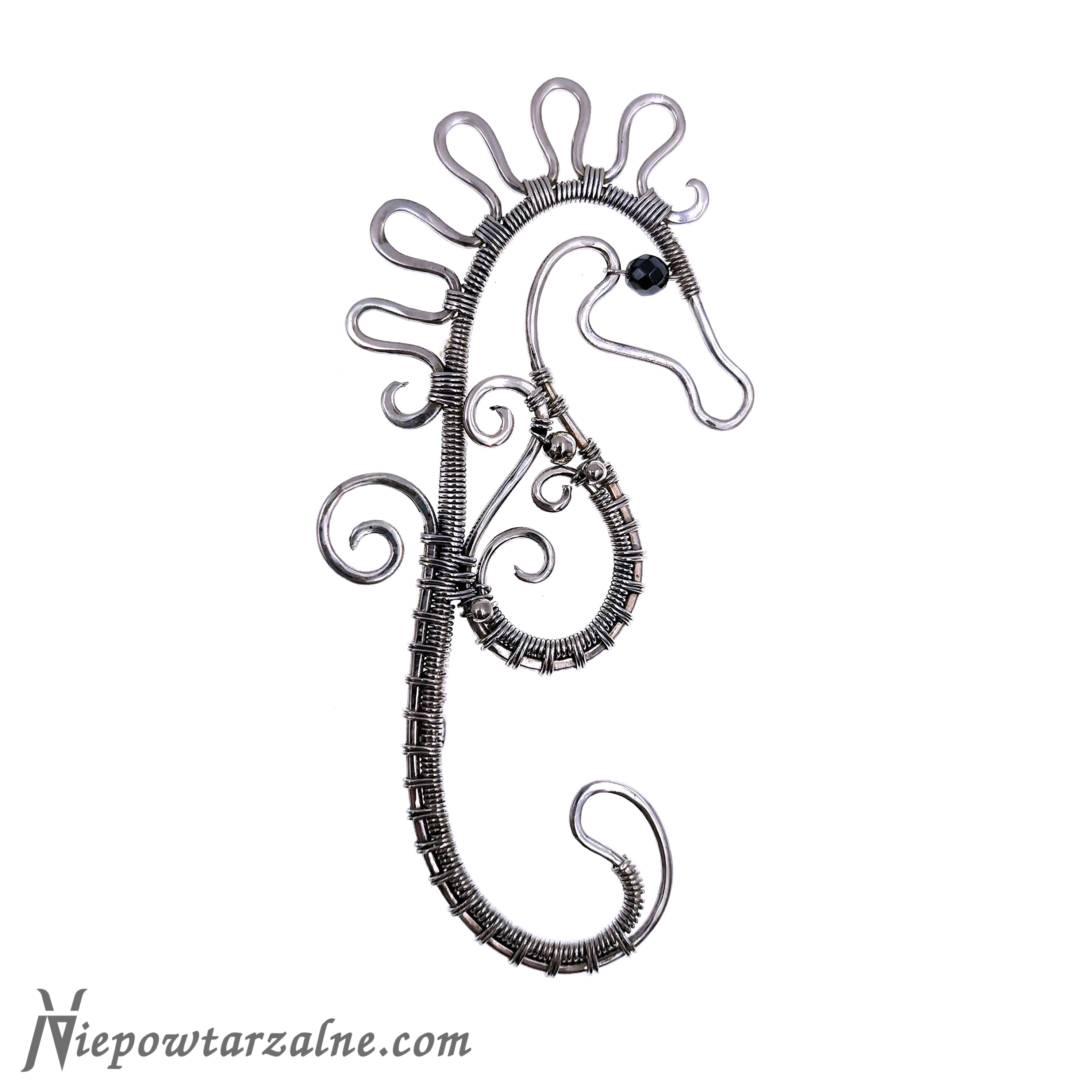 Efektowna broszka w kształcie konika morskiego. Wykonana w całości ręcznie w technice wire-wrapping, ze srebra. Ozdobiony srebrnymi kuleczkami oraz grafitowym hematytem. Zapięcie typu agrafka. Czas na morską przygodę!