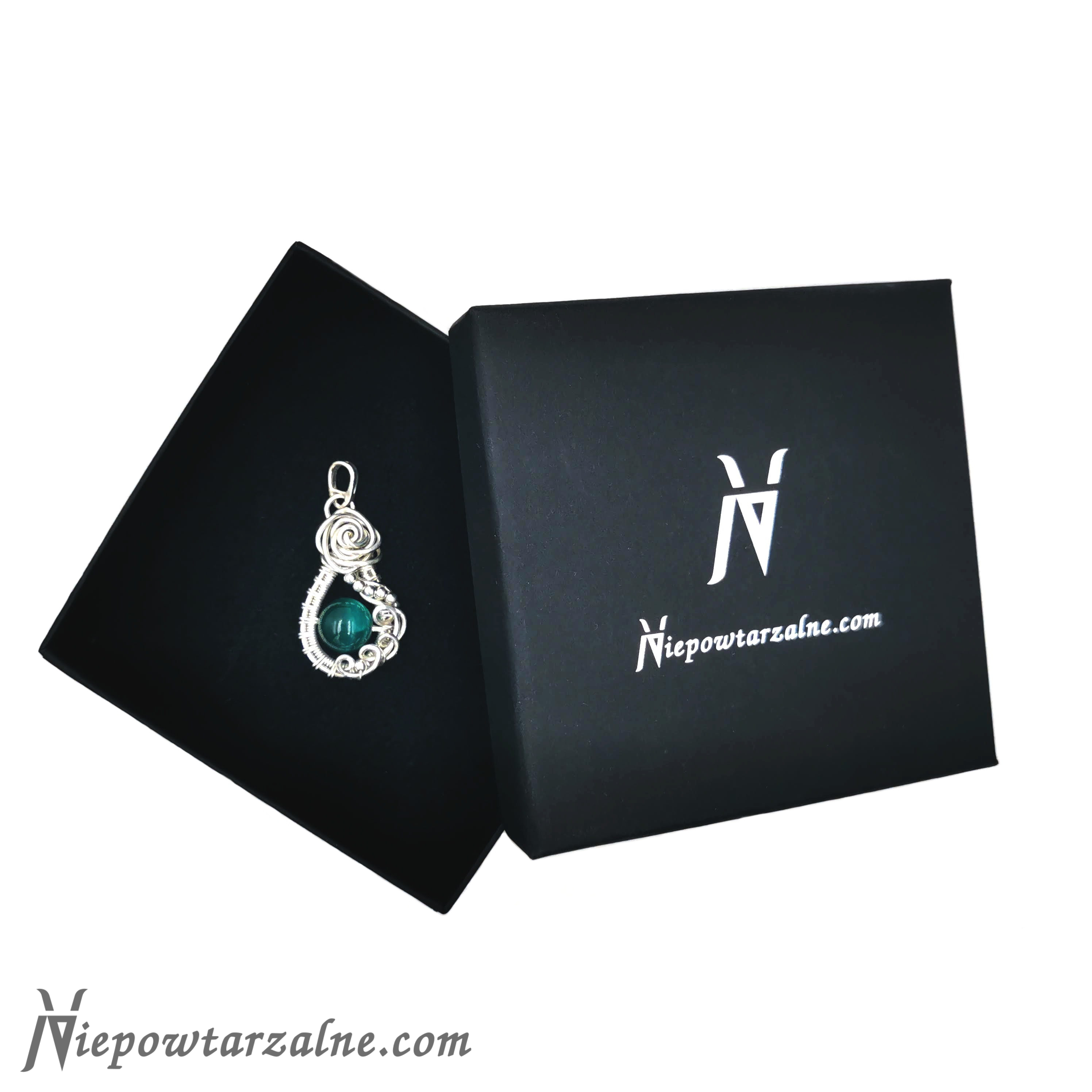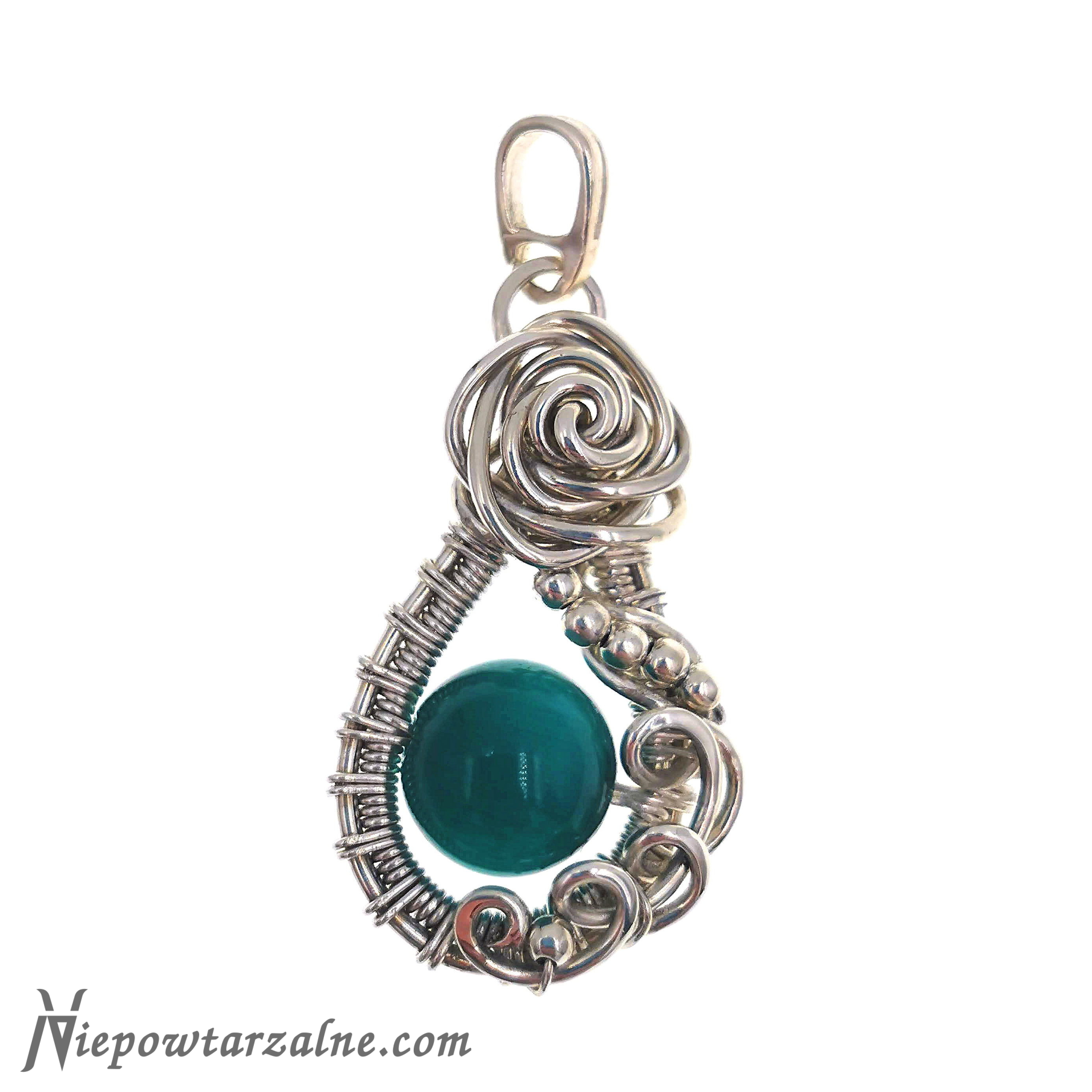 Elegancki wisiorek wykonany w całości ręcznie ze srebra w technice wire-wrapping. Z naturalnym Kocim Okiem w pięknej, ciemnozielonej barwie. Zwieńczenie wisiora stanowi srebrna róża. Piękno i subtelność w każdym calu!