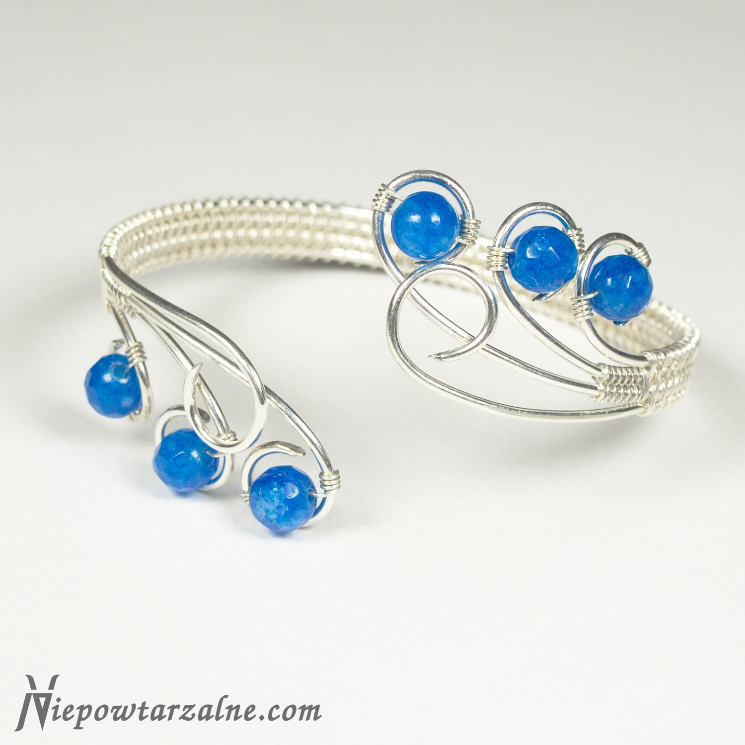 Proszę o szczegółyFinezyjna, ręcznie wykonana bransoletka metodą wire-wrapping. Niezwykle elegancka i subtelna. Zawiera piękne błękitne, fasetowane jadeity. Regulowany obwód.