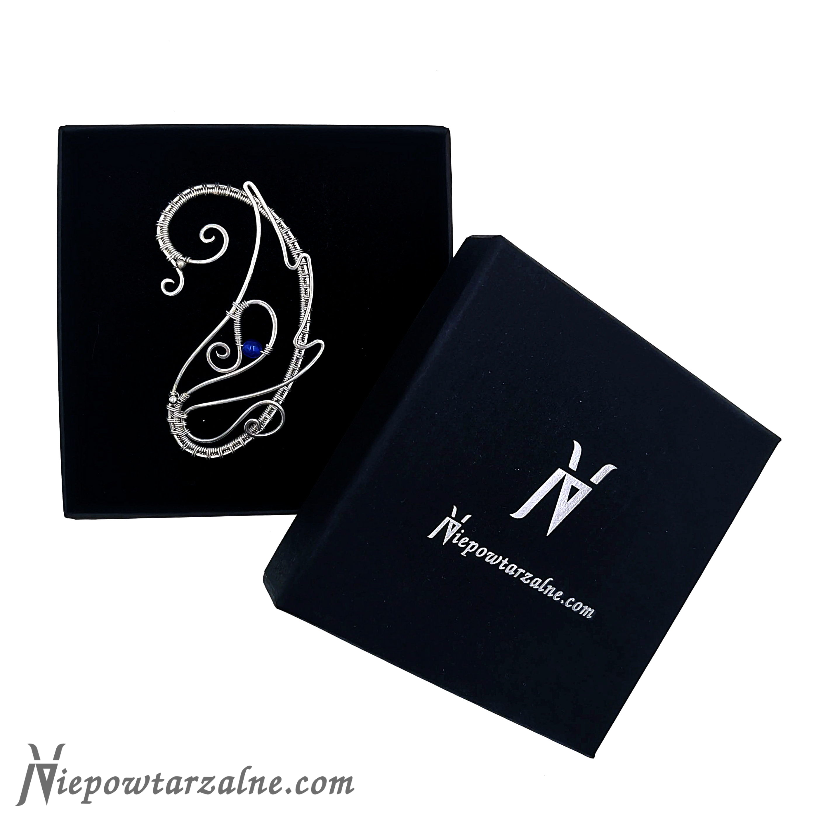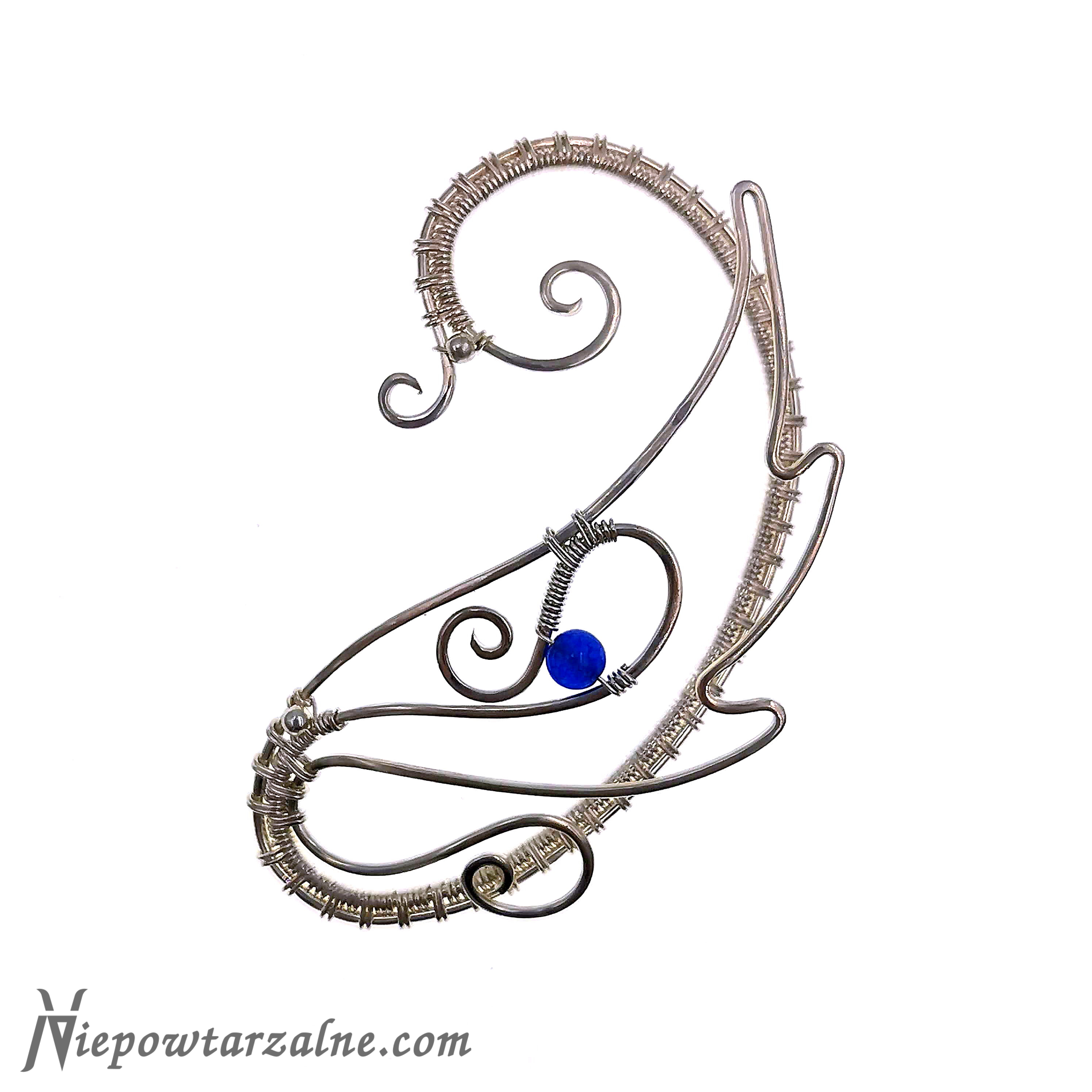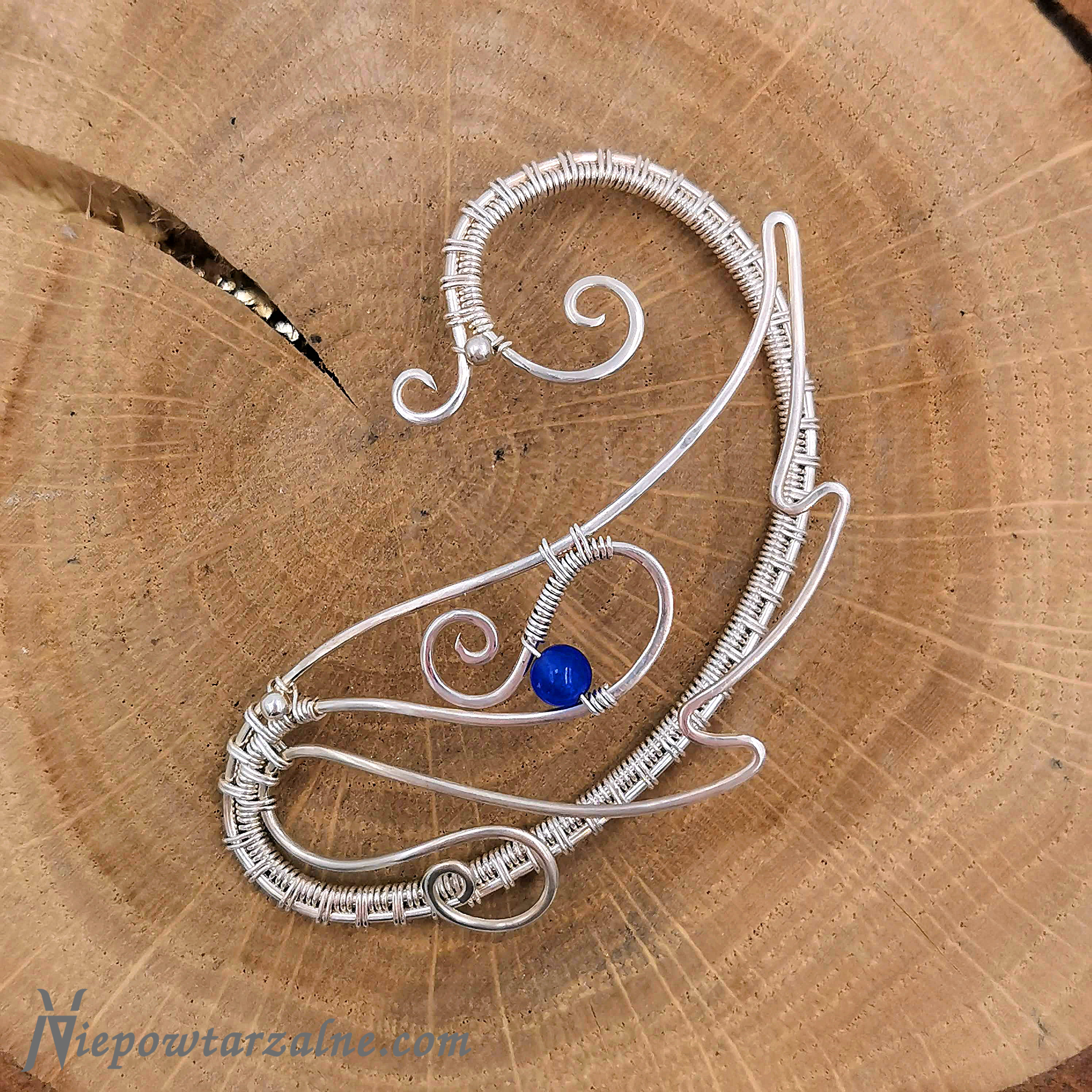 Srebrna nausznica, wykonana w całości ręcznie w technice wire-wrapping. W kształcie skrzydła, ozdobiona niebieskim jadeitem i srebrnymi kuleczkami. Bardzo efektowna!