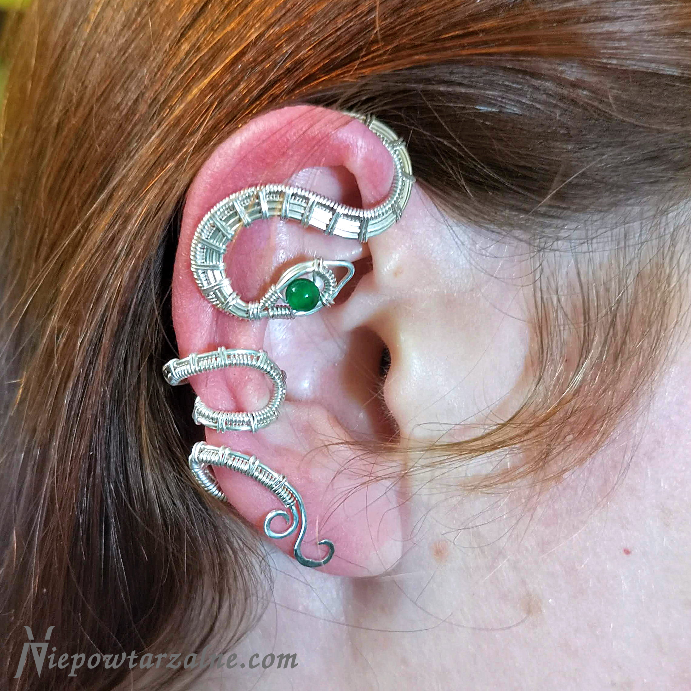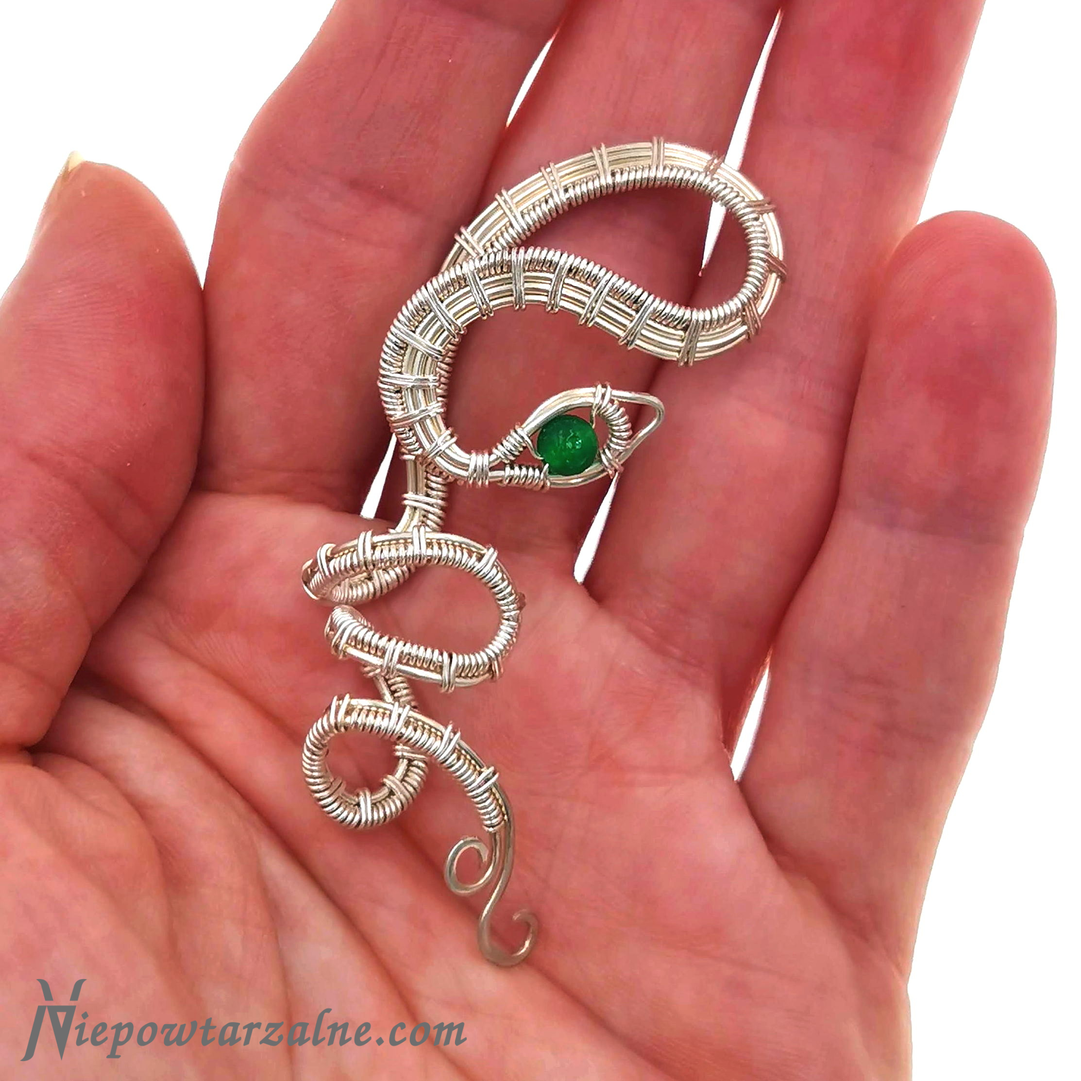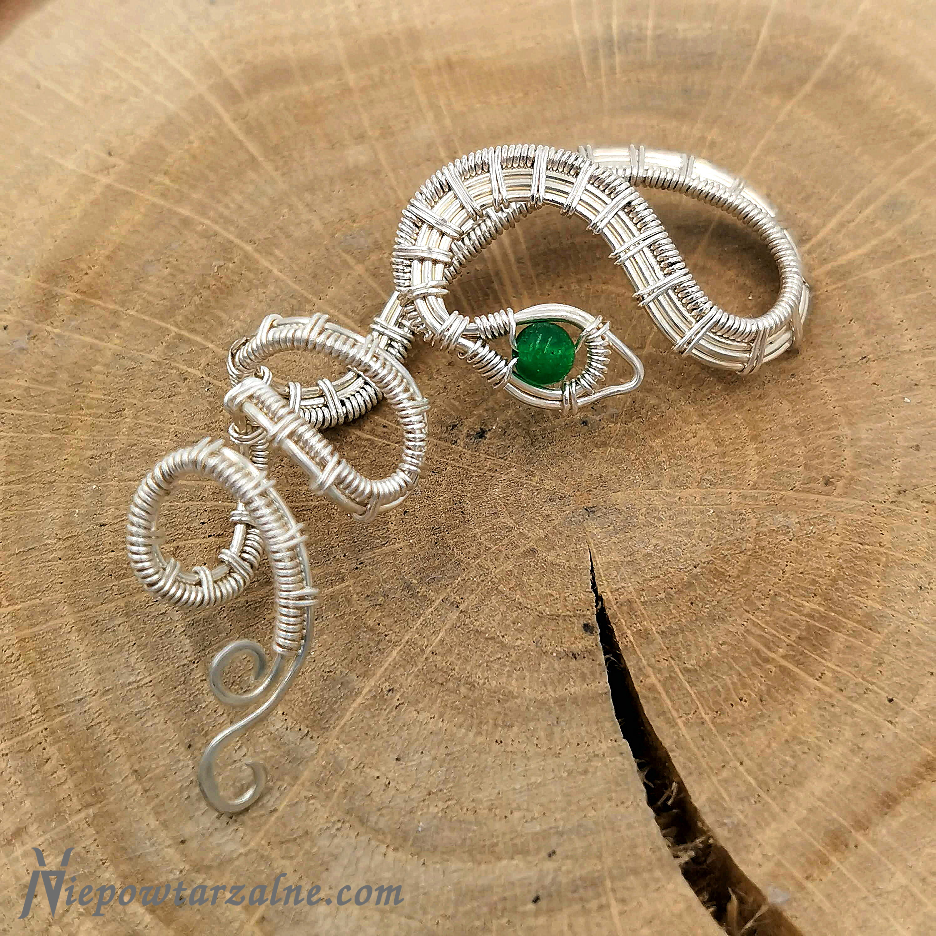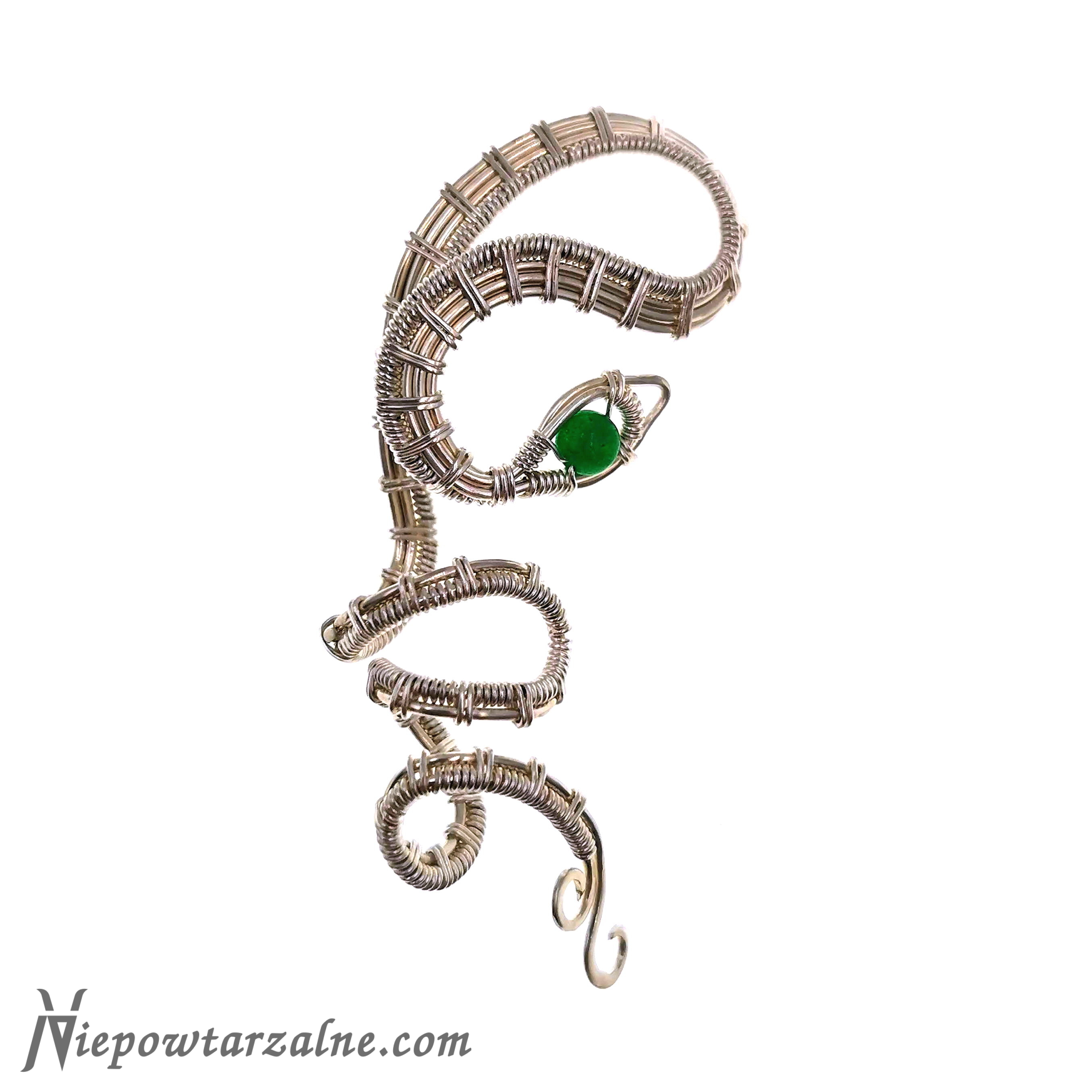 Alternatywa dla kolczyków - nausznica! Idealna również dla osób z nieprzekłutymi uszami. Nausznica ma kształt węża, który ozdobiony jest zielonym jadeitem. Wykonana w całości ręcznie, ze srebra, w technice wire-wrapping.