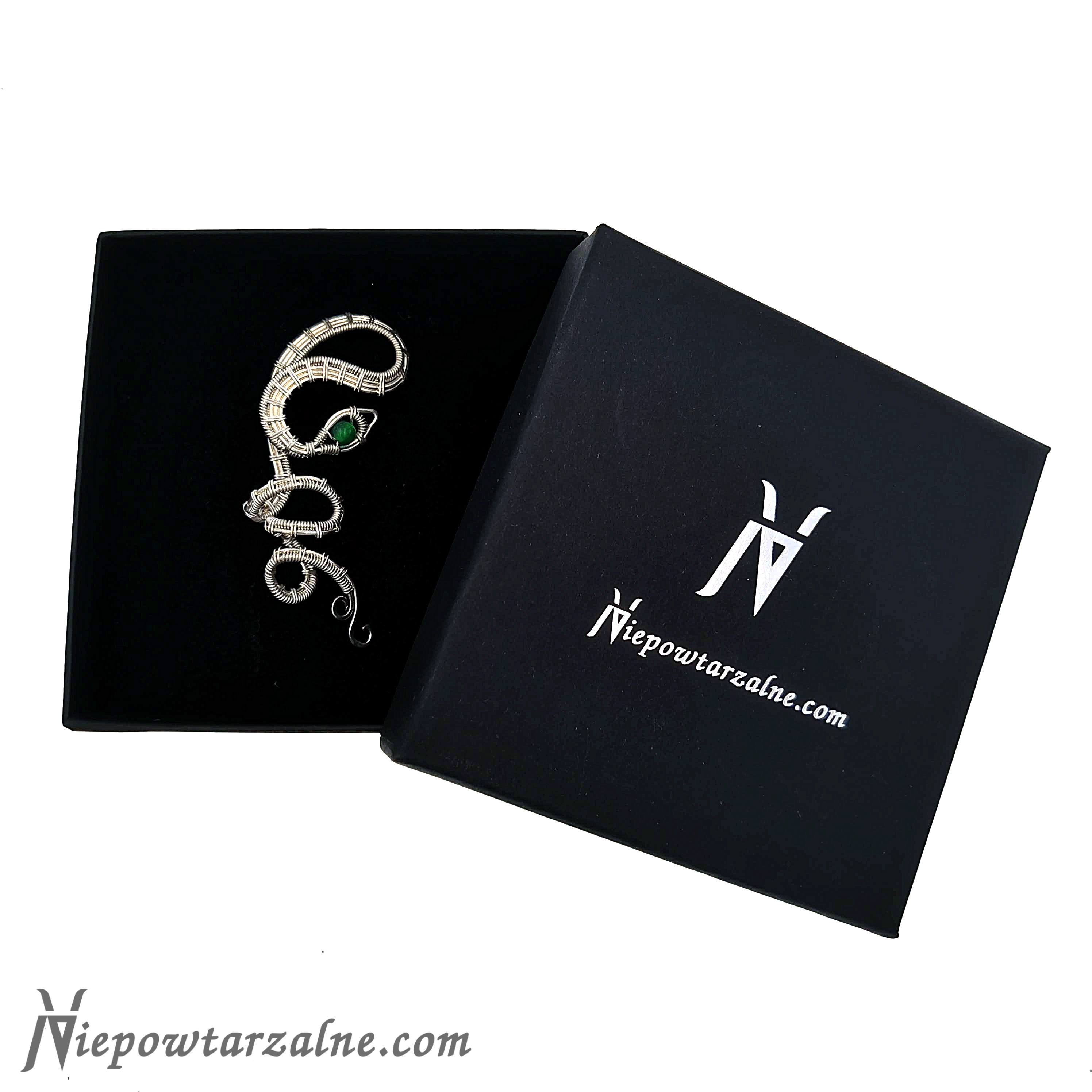 Długość całkowita - 5,5 cm, szerokość - 2,8 cm. Możliwość dopasowania do swojego ucha. Głowa węża ozdobiona jest jasnozielonym jadeitem o średnicy 4,5 mm. Wyrób ocechowany. Dedykowana na ucho prawe. Ucho nie musi być przekłute. Z tyłu naniesiono znak imienny i cechę. Wyrób zapakowany w eleganckie pudełko.
