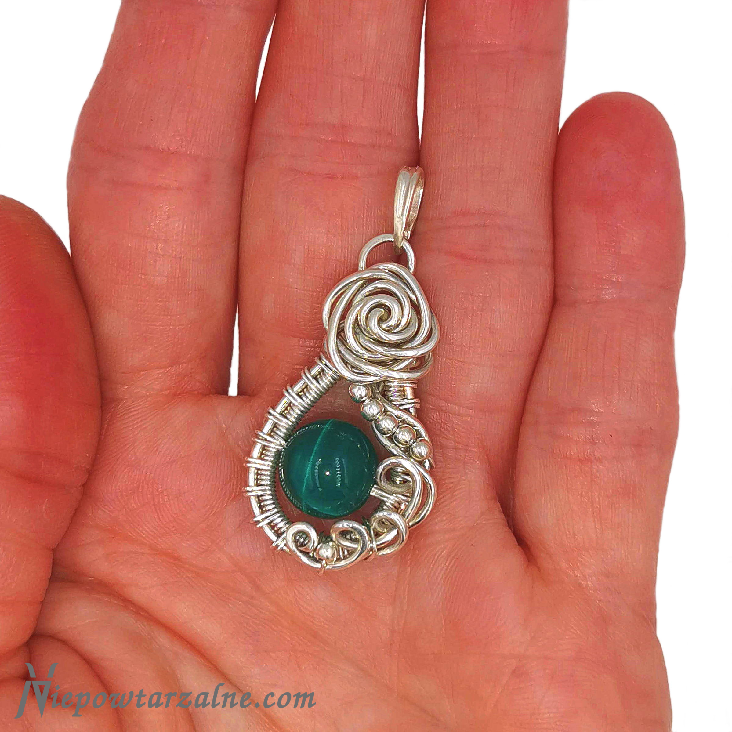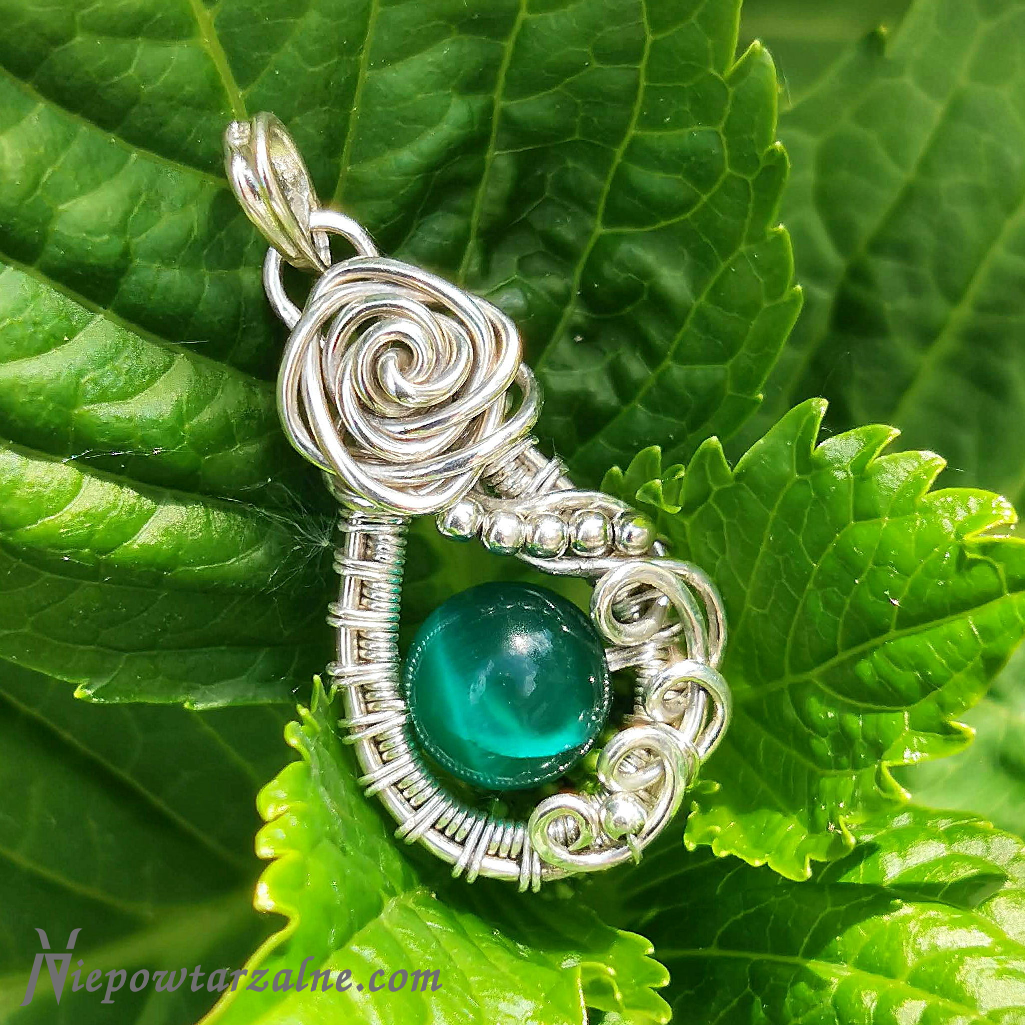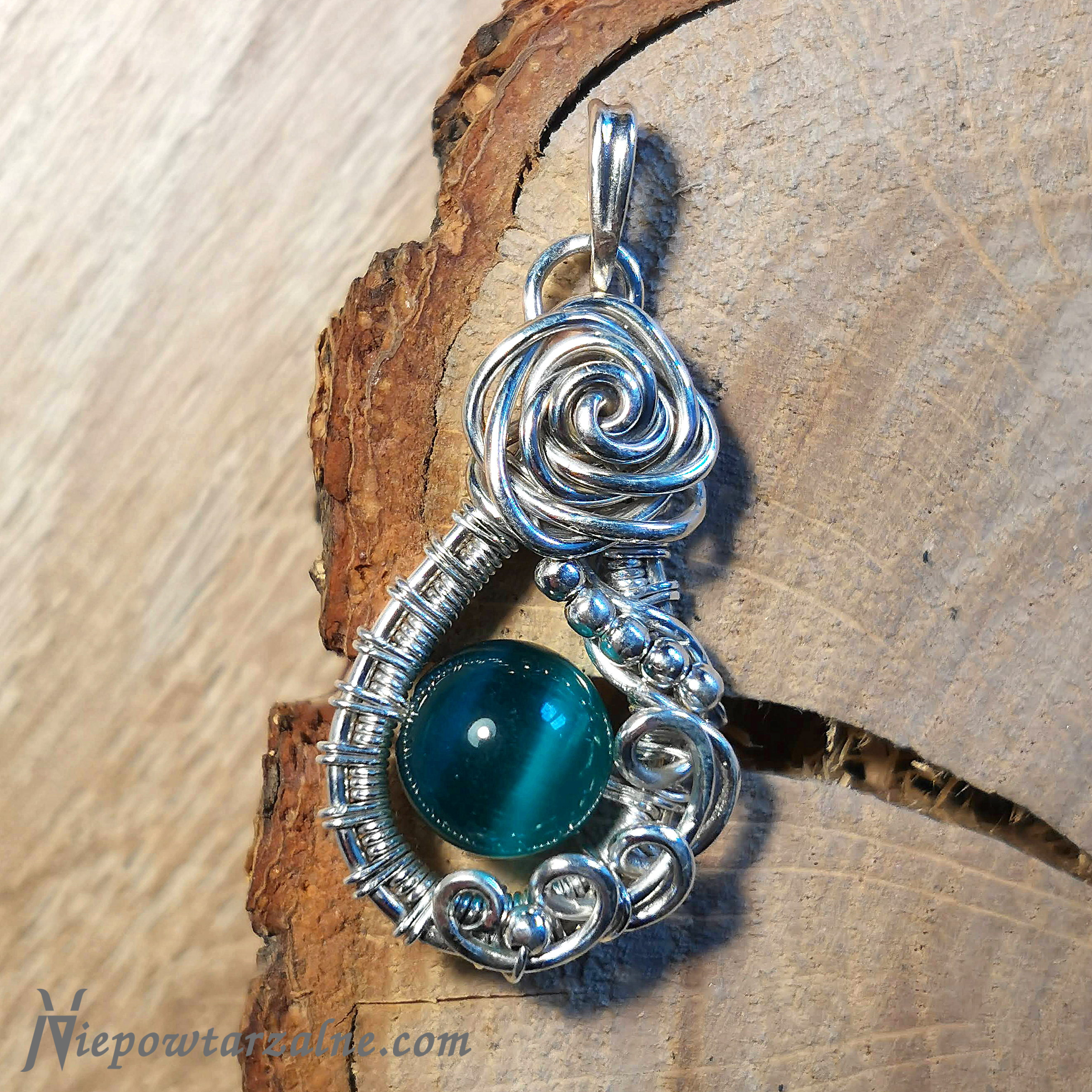 Elegancki wisiorek wykonany w całości ręcznie ze srebra w technice wire-wrapping. Z naturalnym Kocim Okiem w pięknej, ciemnozielonej barwie. Zwieńczenie wisiora stanowi srebrna róża. Piękno i subtelność w każdym calu!