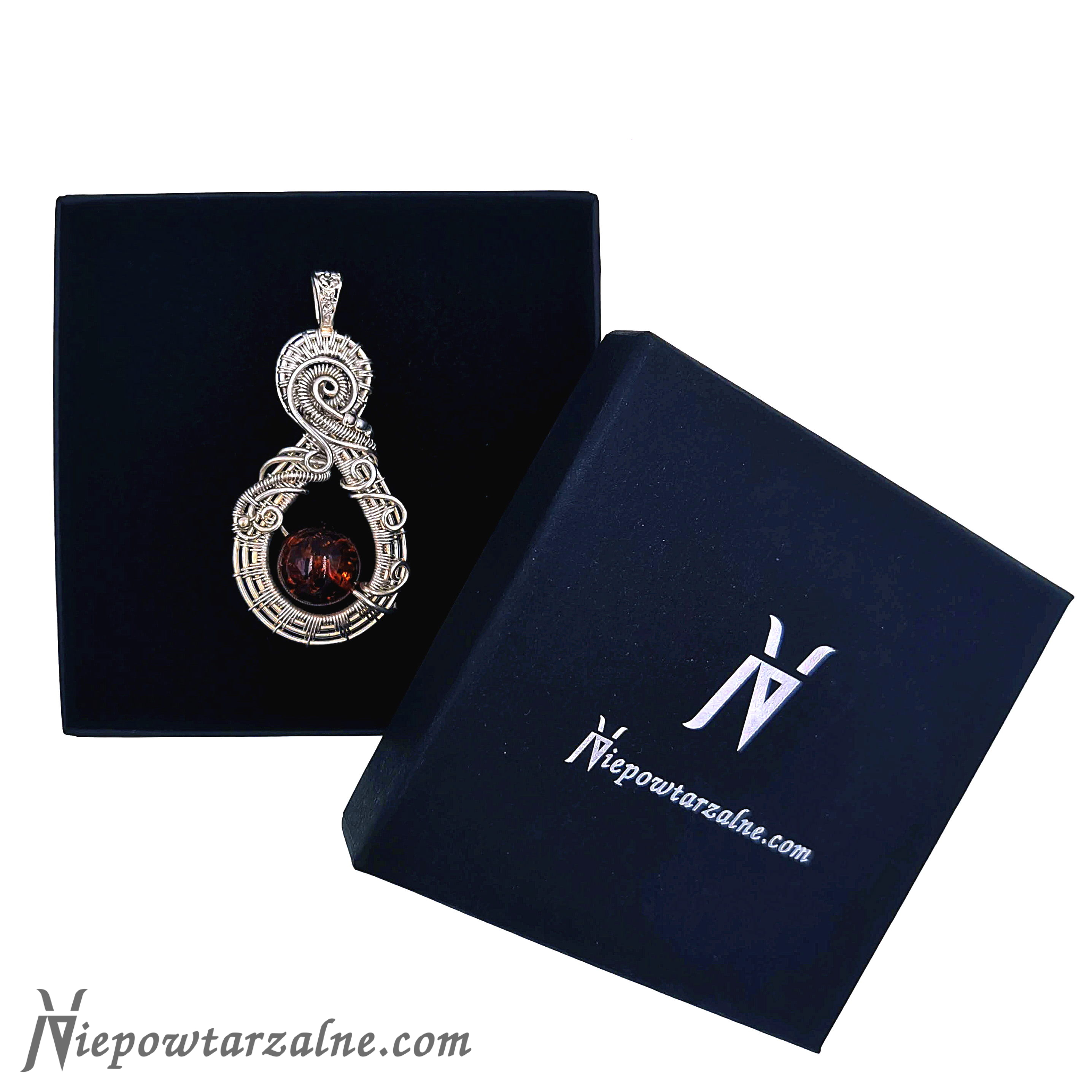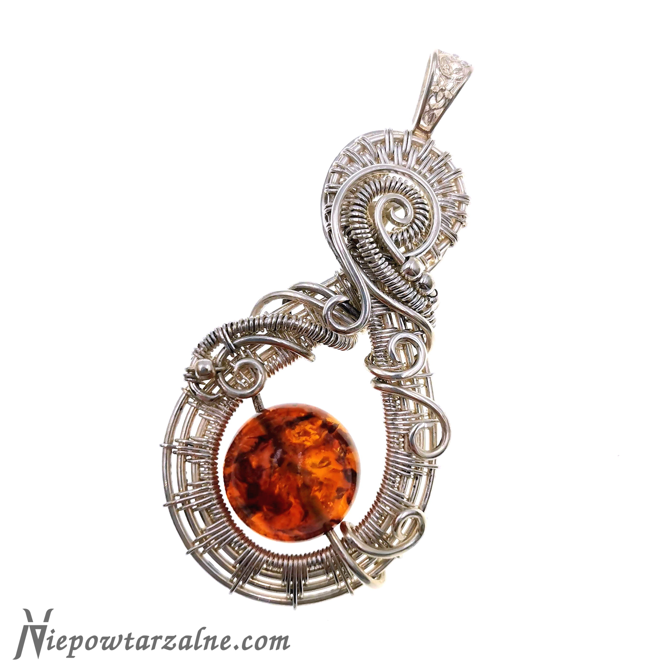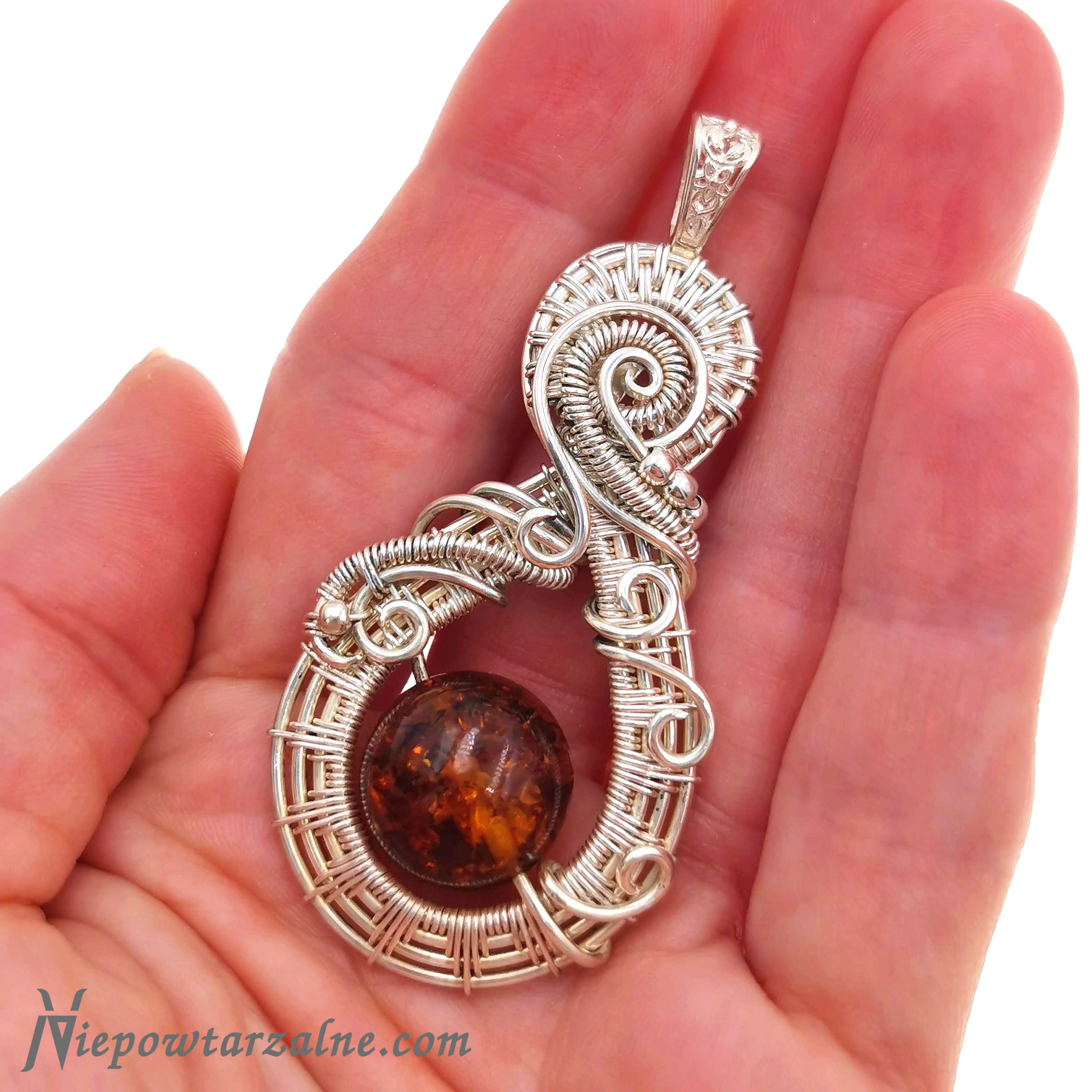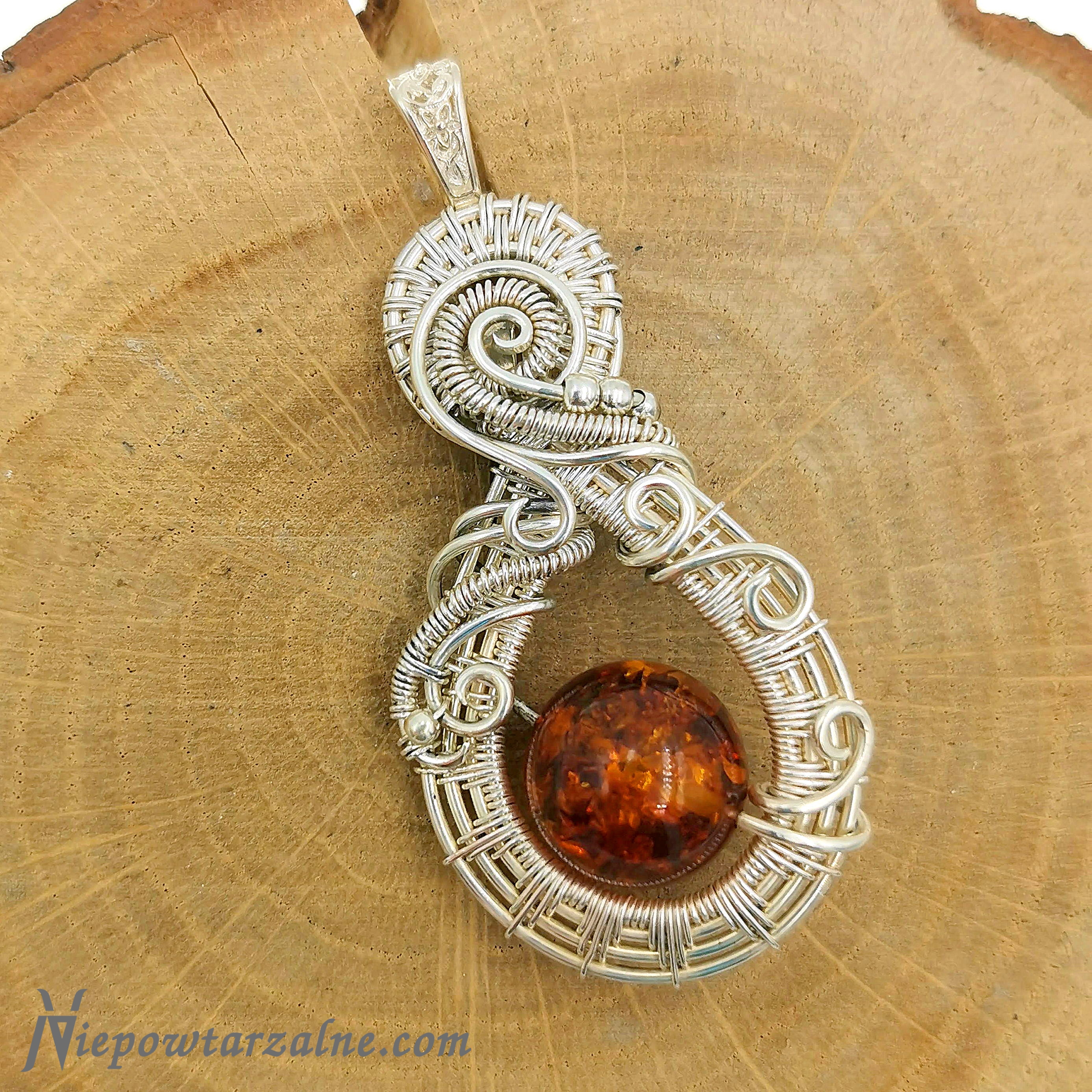 Okazały i kunsztowny wisior z naturalnym bursztynem bałtyckim. Wykonany w całości ręcznie, ze srebra, w pracochłonnej technice wire-wrapping.